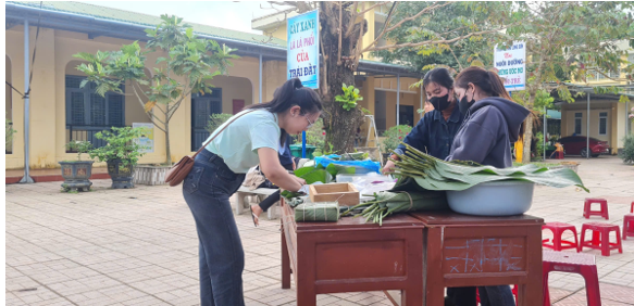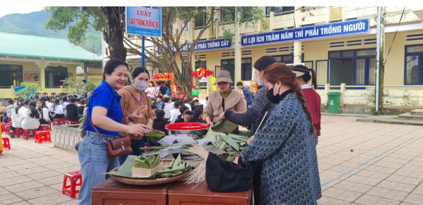 Một trong những hoạt động nổi bật của ngày hội là phần thi gói bánh chưng, bánh tét và bánh lá dong của người Hrê với sự tham gia của giáo viên, phụ huynh và học sinh các lớp. Trong không khí háo hức, các đội đã cùng nhau chuẩn bị nguyên liệu, khéo léo gói từng chiếc bánh vuông vắn, gửi gắm vào đó tình cảm gia đình và niềm tự hào về truyền thống dân tộc.